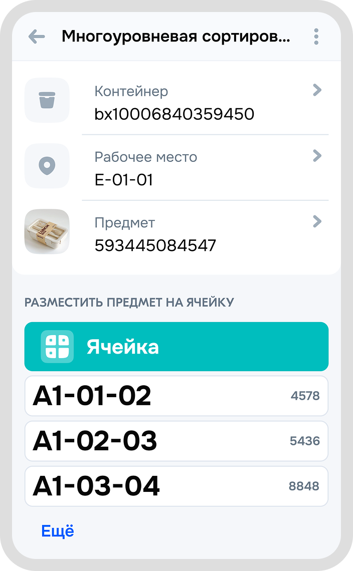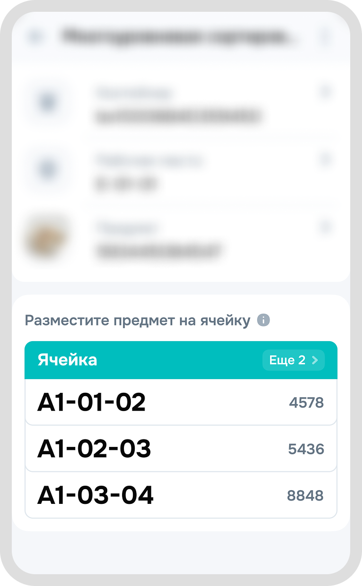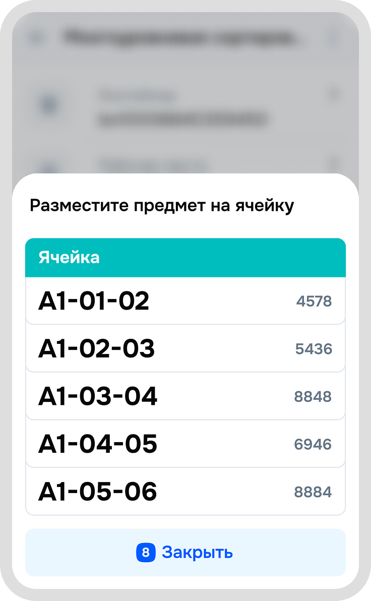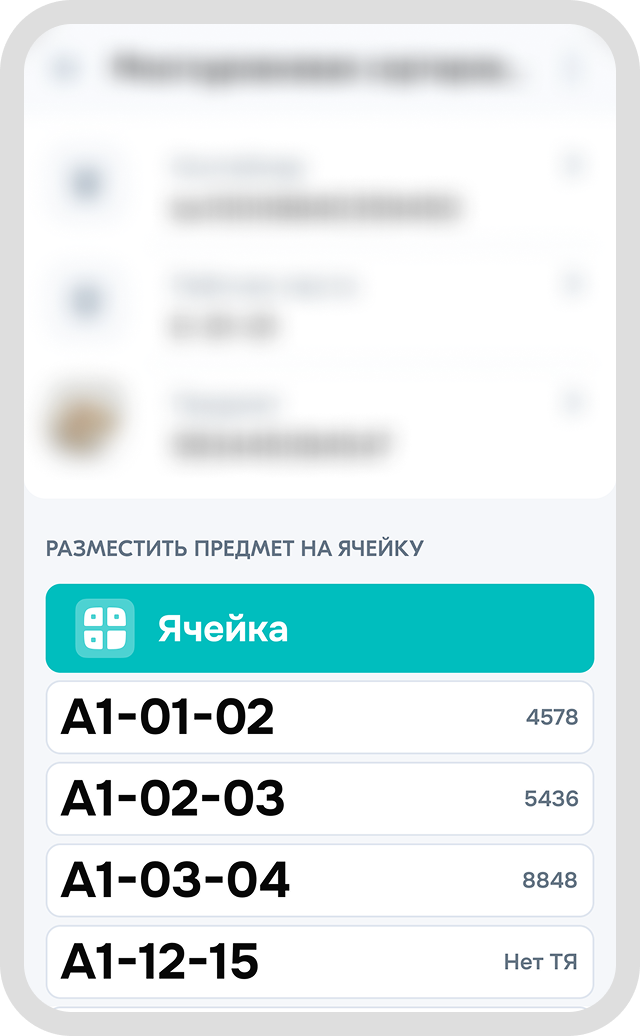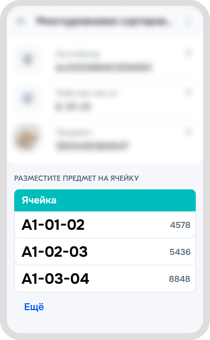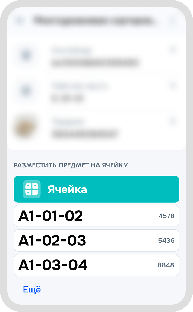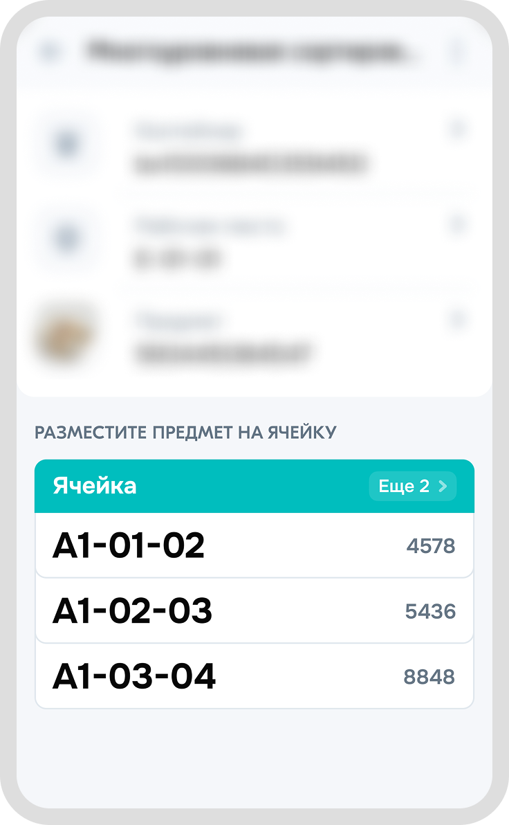 Чтобы разместить предмет, достаточно просто отсканировать штрихкод. Система покажет, в какие ячейки необходимо разместить предмет. Процесс одинаково работает для всех типов складских помещений.