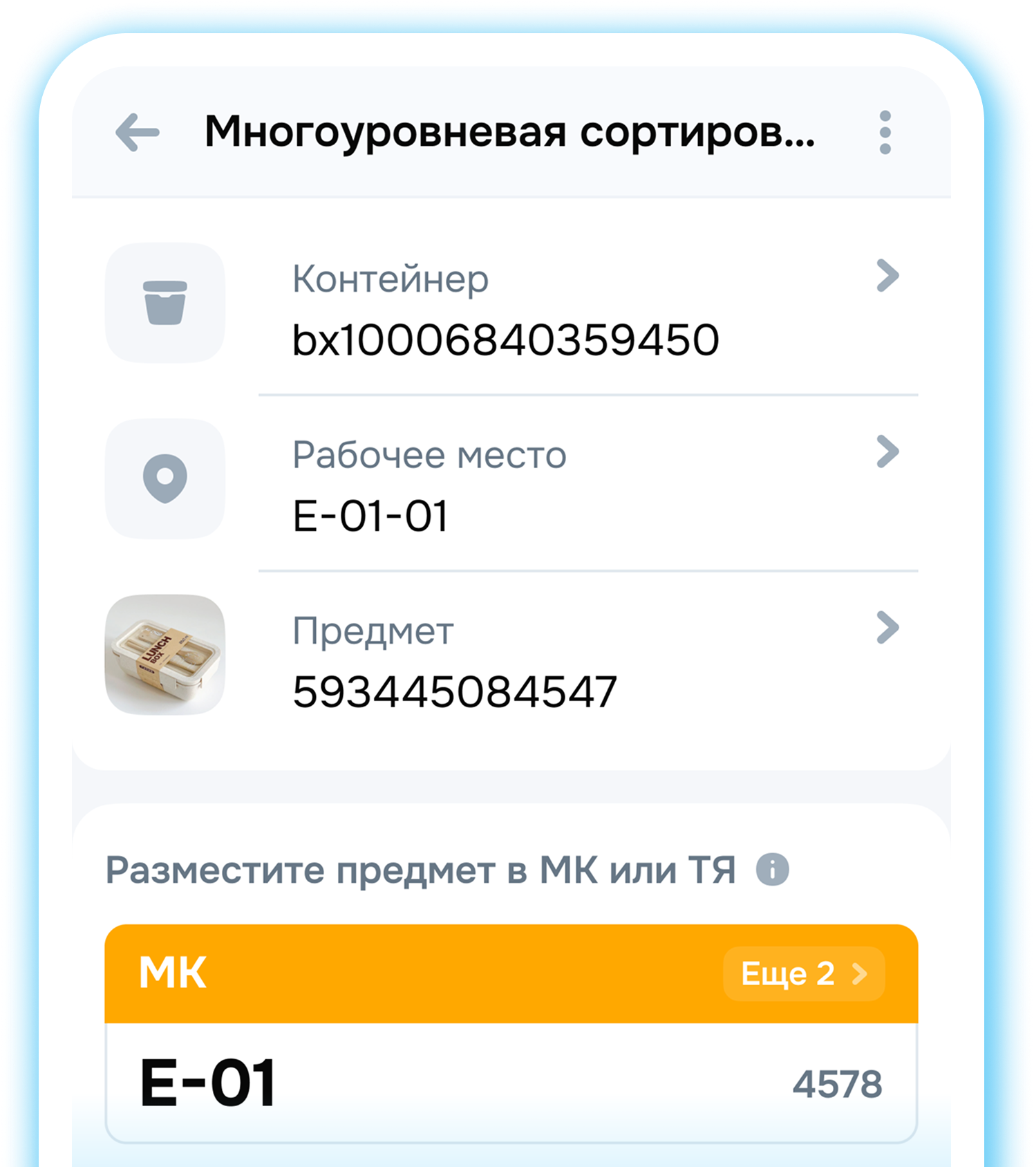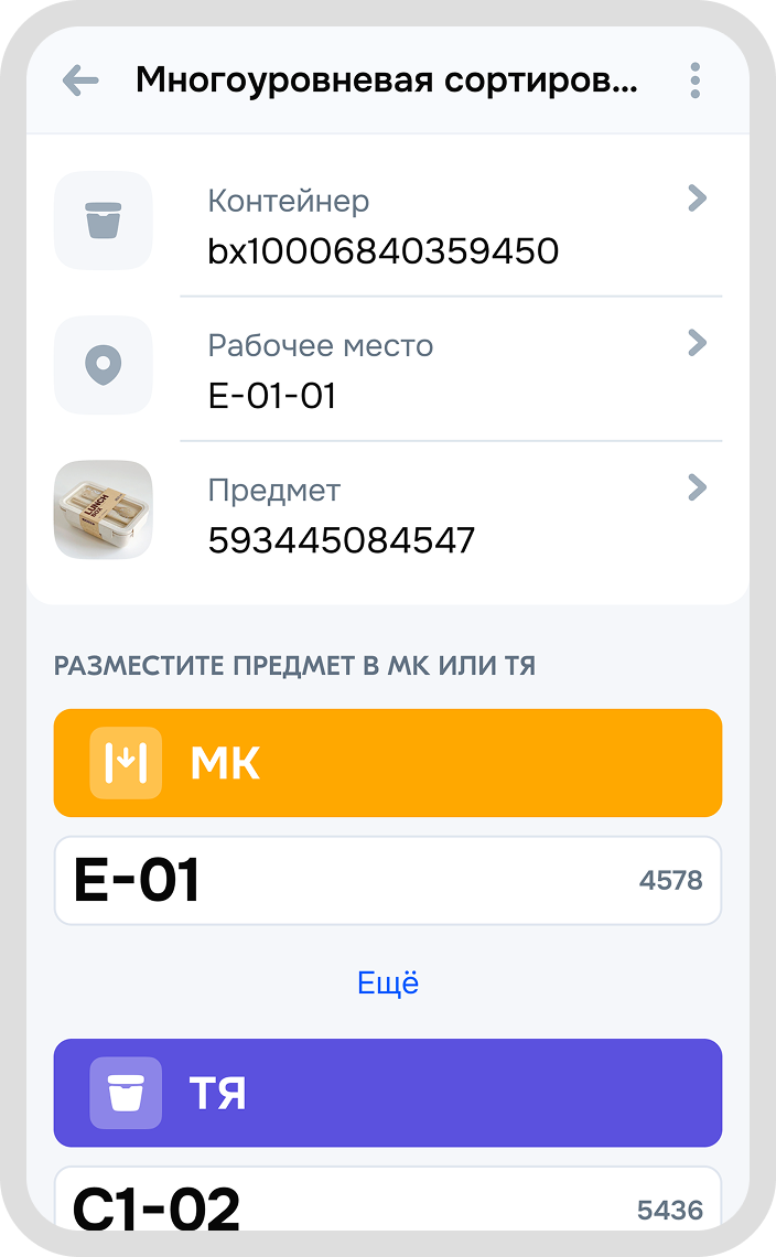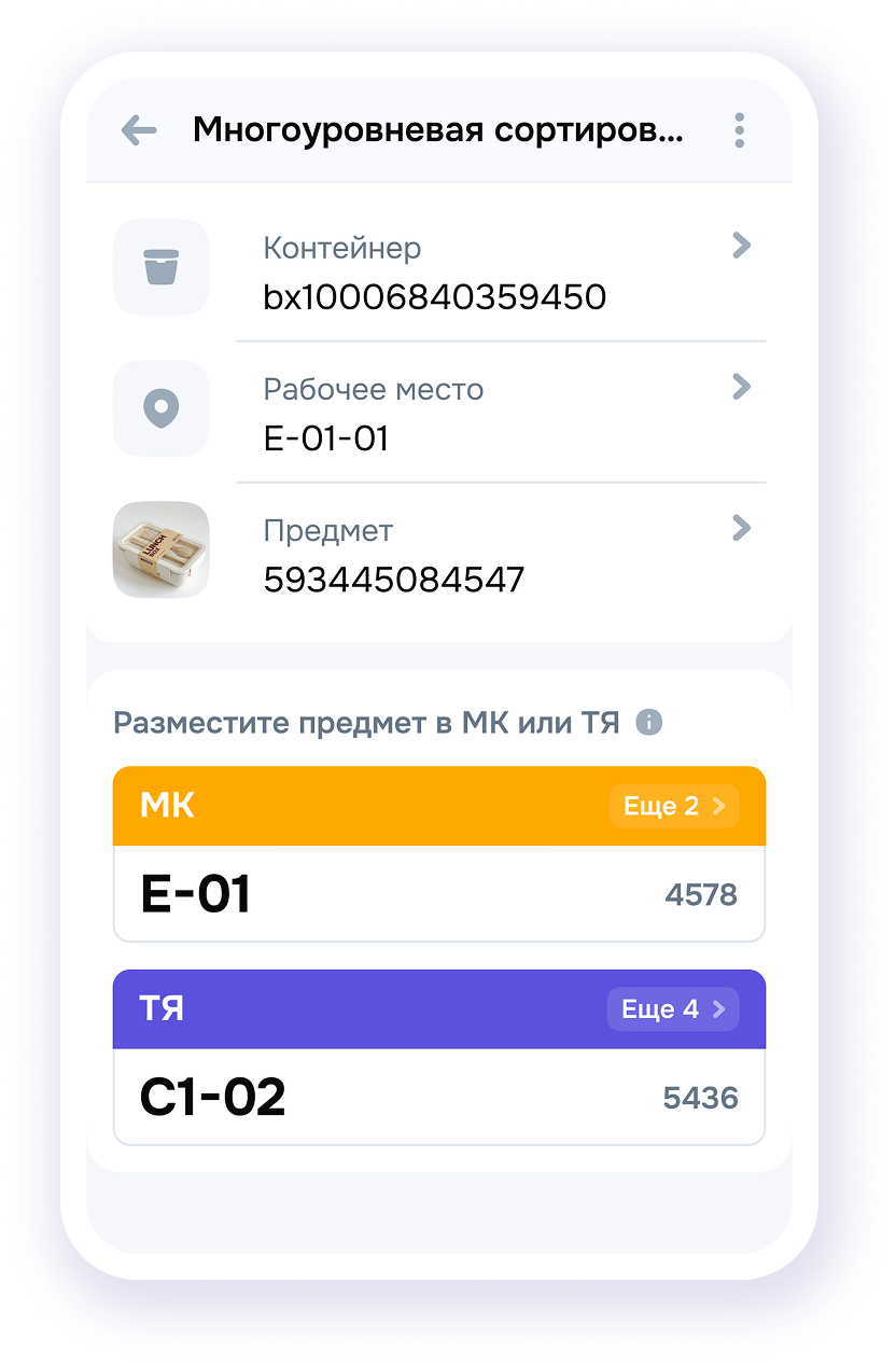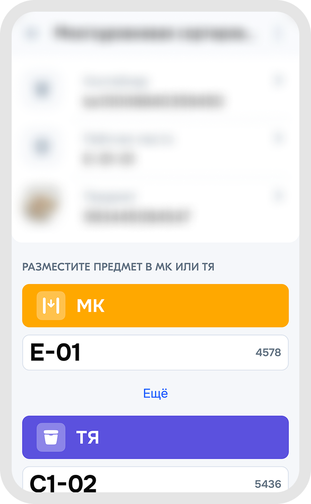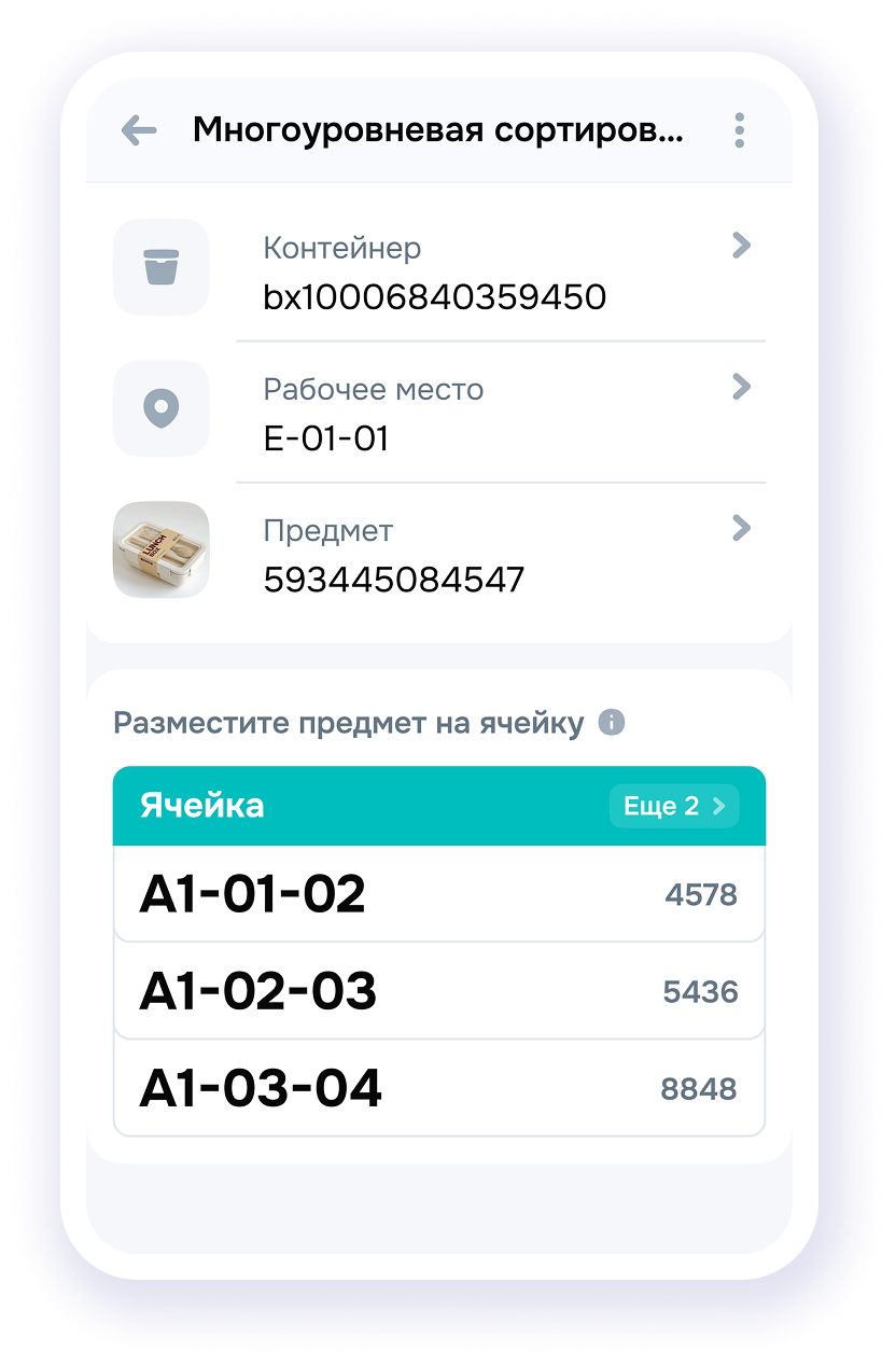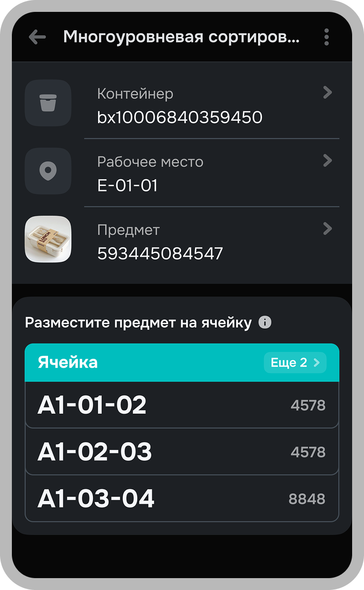 Чтобы разместить предмет, достаточно просто отсканировать штрихкод. Система покажет, в какие ячейки необходимо разместить предмет. Процесс одинаково работает для всех типов складских помещений.
