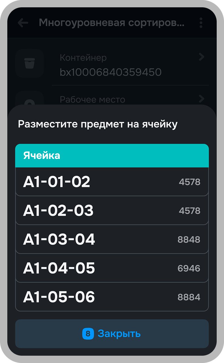 ТСД показывает список ячеек, в которые нужно разместить предмет